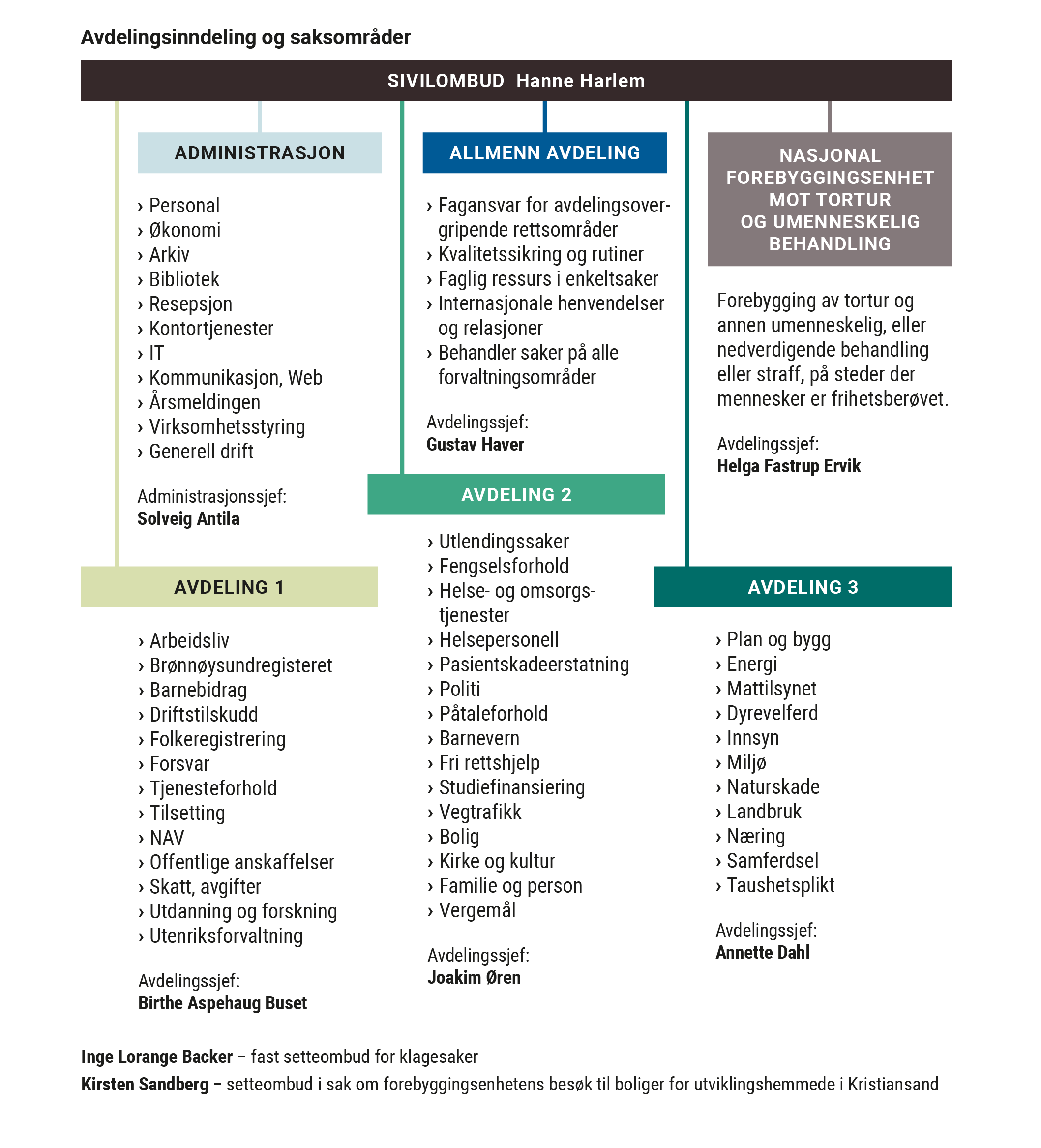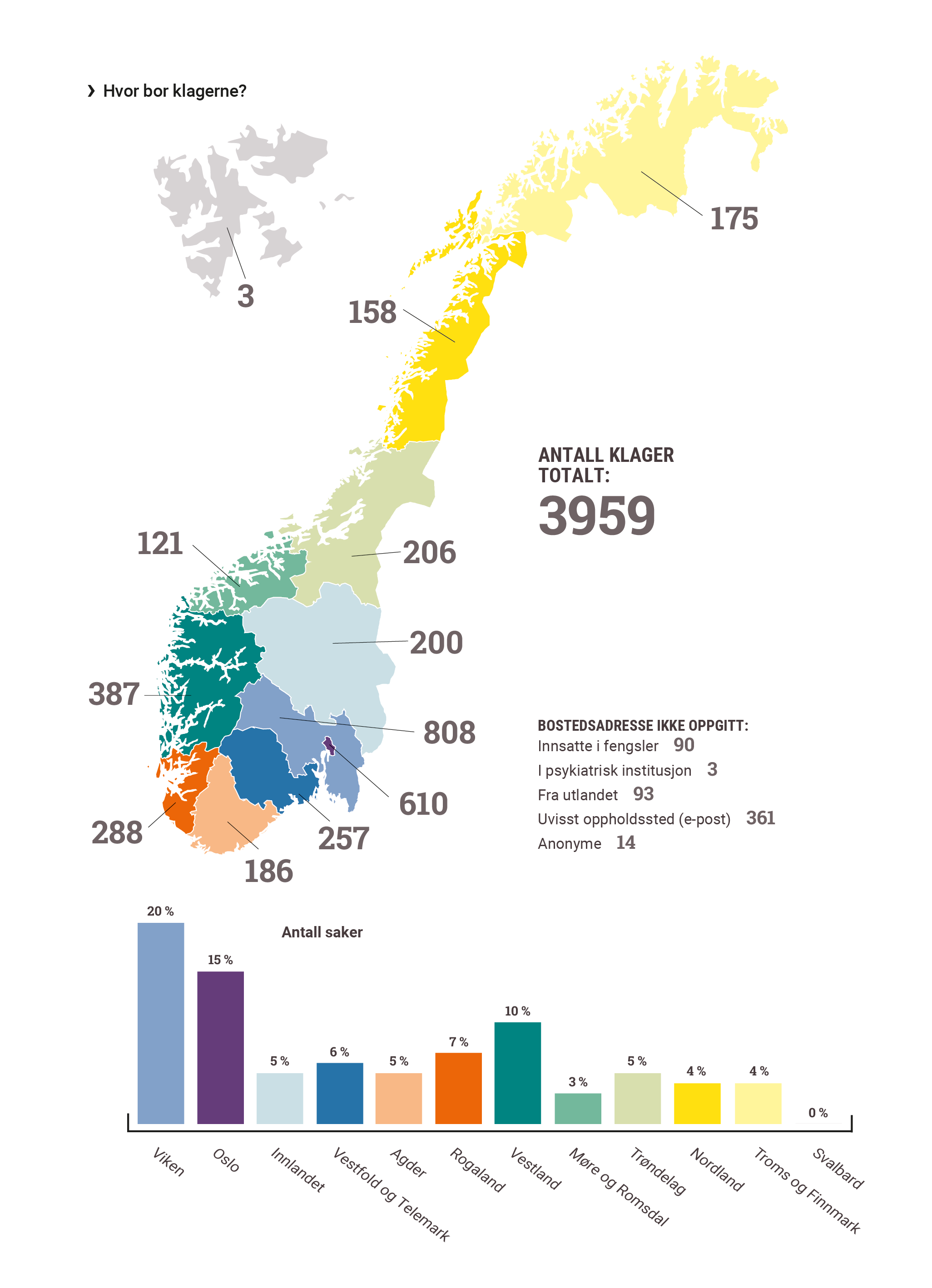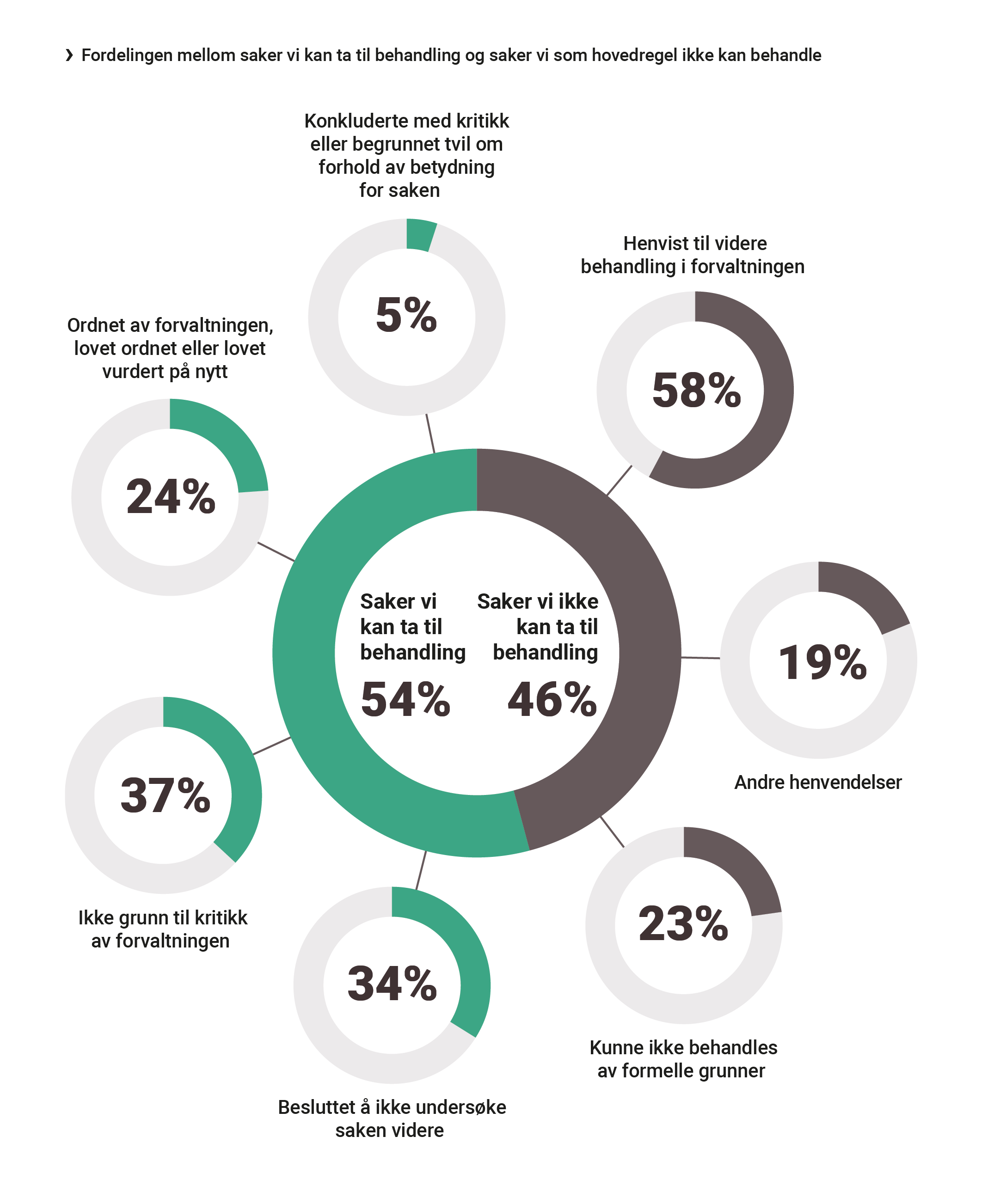 Vi mottar og behandler rundt 4000 klager i året fra enkeltmennesker som mener at myndighetene har gjort en feil. Sakstilfanget varierer fra klager på inn­synsnekt til vedtak fra Nav og familiegjenforenings­ saker i utlendingssektoren. I tillegg får vi mange klager på lang saksbehandlingstid og manglende svar. Antagelig er det også mange som ikke klager hit, selv om den enkelte mener det er gjort feil.