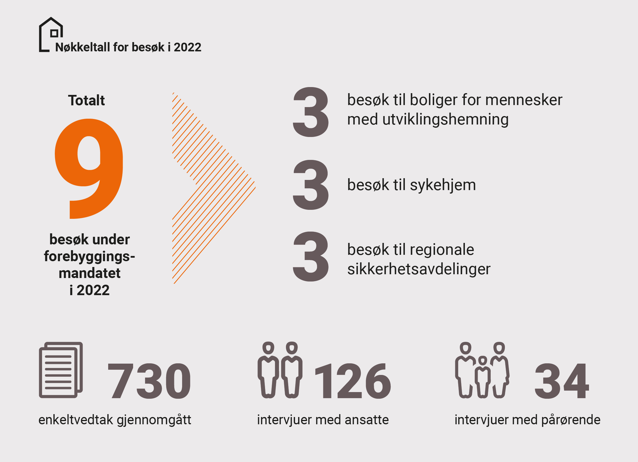Sivilombudets forebyggingsarbeid var tematisk variert i 2022. I første halvår besøkte vi tre sykehjem i Lørenskog og Oslo og tre bosteder for mennesker med utviklingshemning i Bodø kommune. Med disse besøkene avsluttet vi undersøkelser som har strukket seg over to år, av forholdene for mennesker som lever med omfattende begrensninger under kommunal omsorg. Besøkene har avdekket tydelige utfordringer for rettssikkerheten til beboere både på sykehjem og i boliger for mennesker med utviklingshemning, og vi skriver om dette i en egen temaartikkel i årsmeldin­gen. Gjennom høsten møtte vi sentrale aktører for å følge opp disse funnene, herunder ansvarlige depar­tement, direktorater, tilsynsmyndigheter og interesse­ organisasjoner. Vi foreleste også om dette temaet for vernepleiere og barnevernspedagoger.