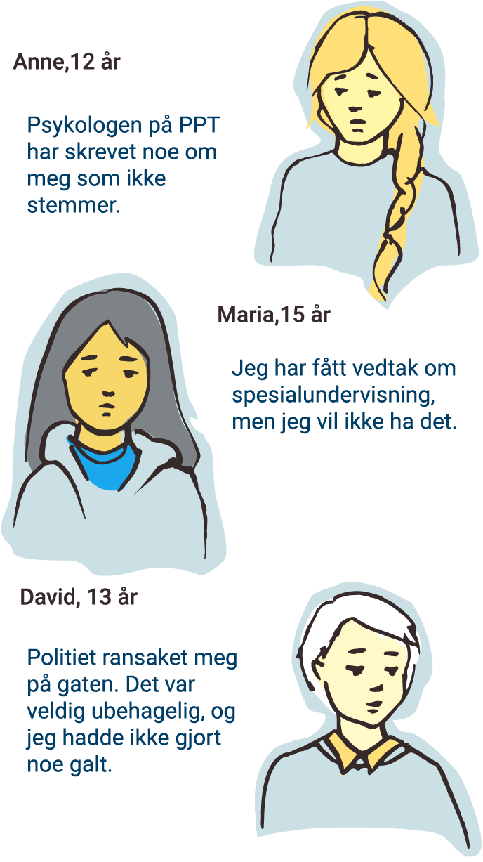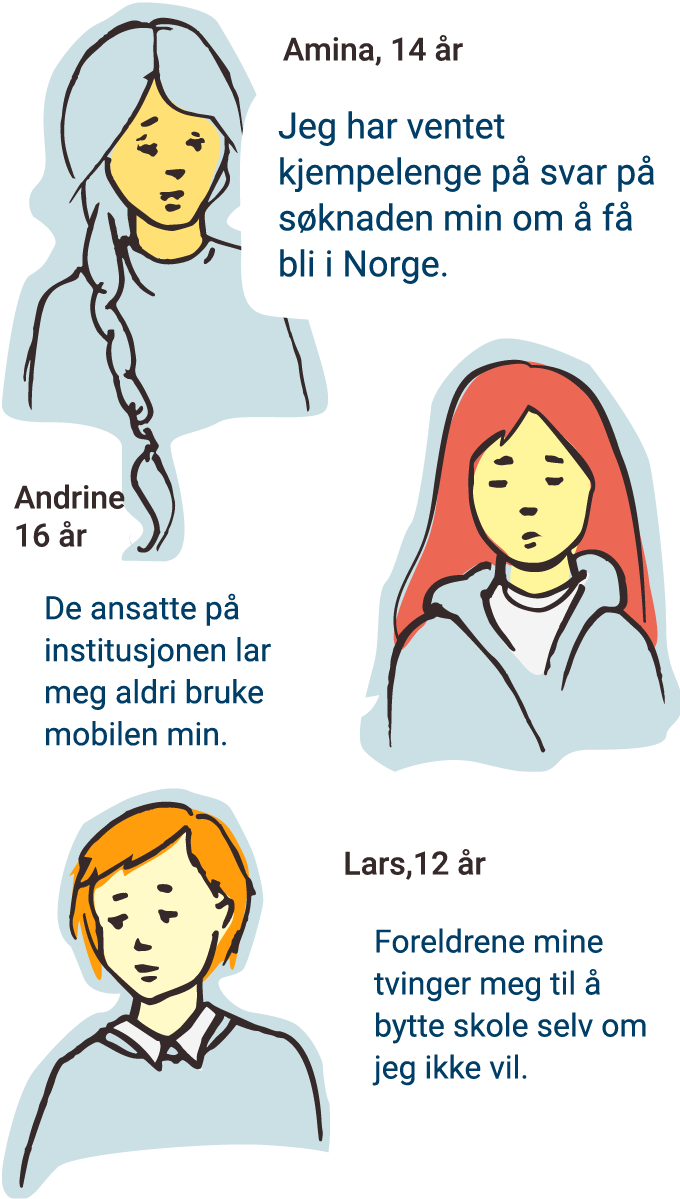Alle barn og unge har rett til å bli hørt i alle saker som handler om dem selv. Du har rett til å si hva du tenker og mener om det som skjer med deg. Hvis du ikke har blitt hørt i en sak som blant annet gjelder helsen din, skolegangen din eller hvordan du har det på institusjon, kan du klage til Sivilombudet.